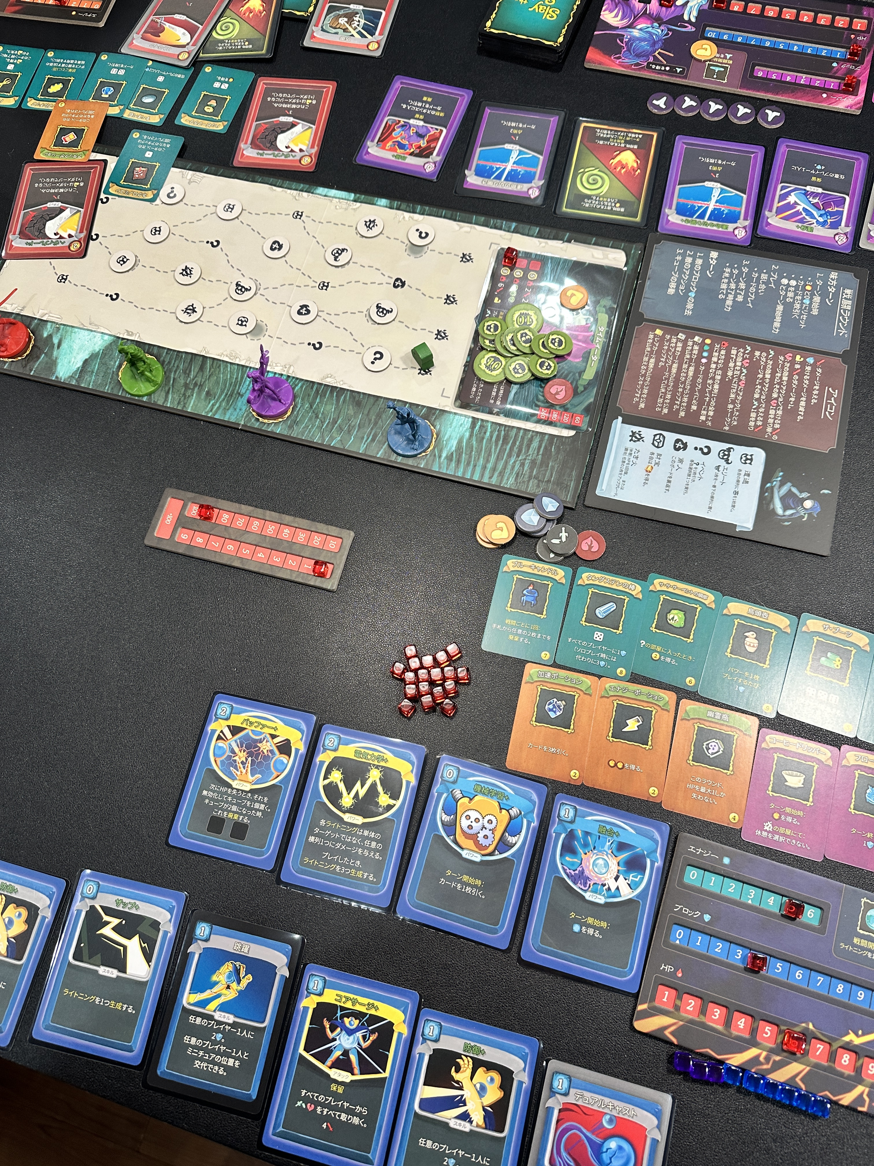 戦闘中の処理は、カードプレイのコスト管理、トークンの付け外し、リシャッフル等を繰り返します。さすがに面倒過ぎです。もちろん、デジタル版なら全て自動で処理されます。