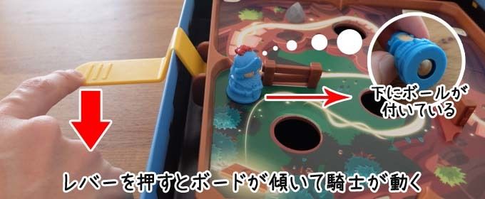 レバーを下に押すと、テコの原理でボードが傾くようになっています。騎士の下には「ボール」が付いているので、少し傾けるとスルスルーと動き出します。