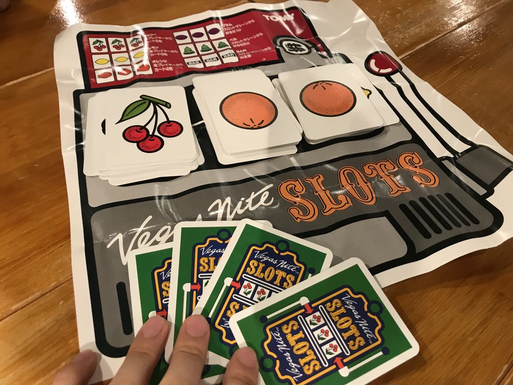 手番としては、自分の山札から一番上を表にして、そのカードをスロットを模した盤の3つのカード置き場のどっかに置きます。