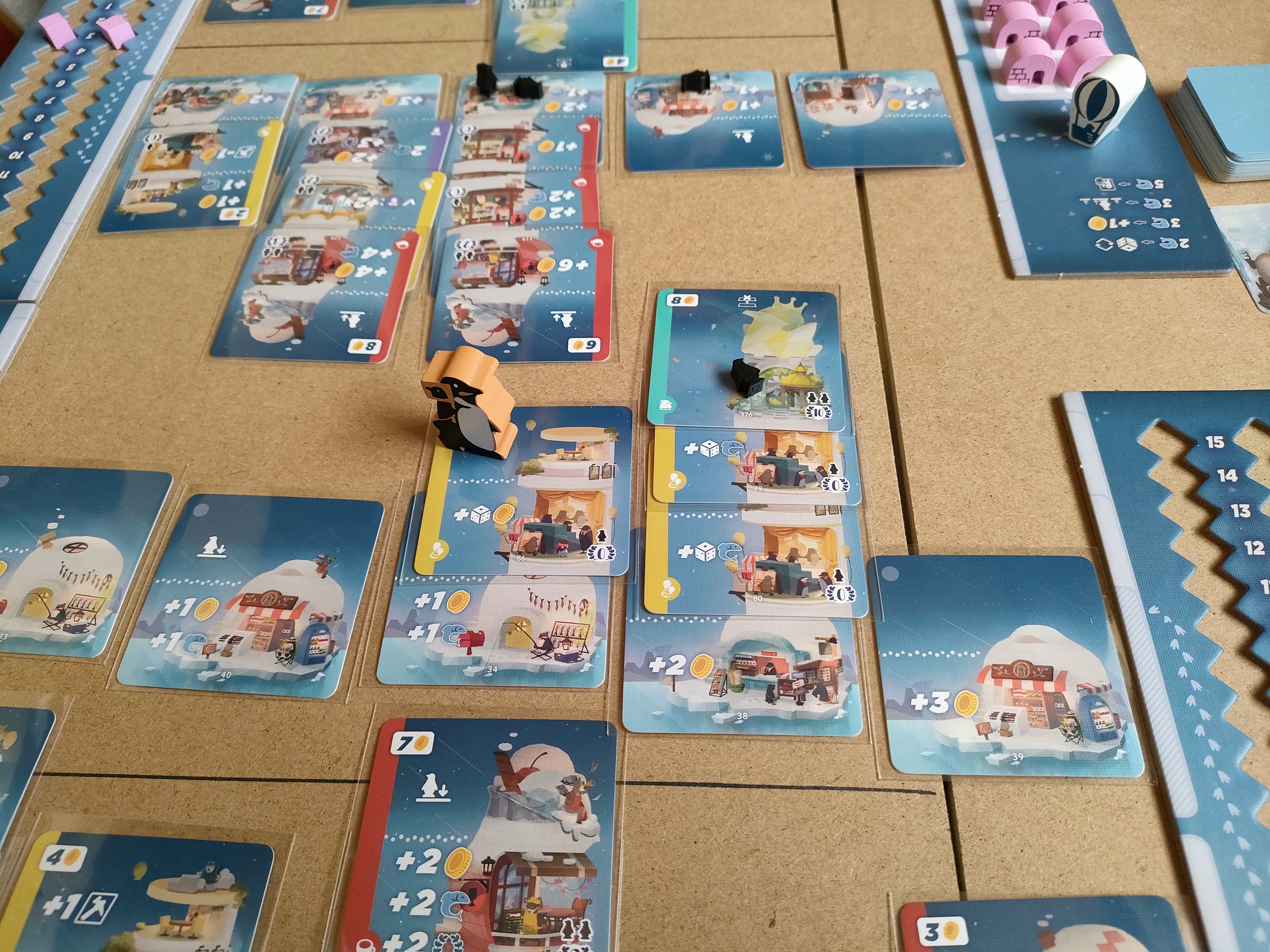 ペンギン町長が村の発展に奮闘する周回すごろくゲーム。建物の増築かスタッフを増やして発展ポイントを増やします。魚で観光客を呼び込んだり販売して収益を得たりします。ダイスドラフトもあるので運が絡みますが魚でダイス振り直し出来ます。