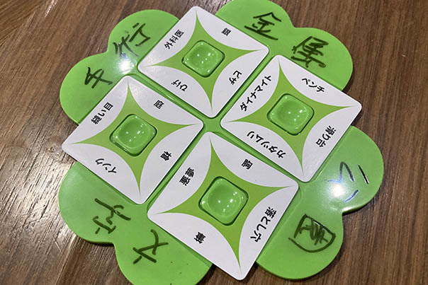 写真のように、カードには単語が4つ書かれており、4枚をランダムに並べる。