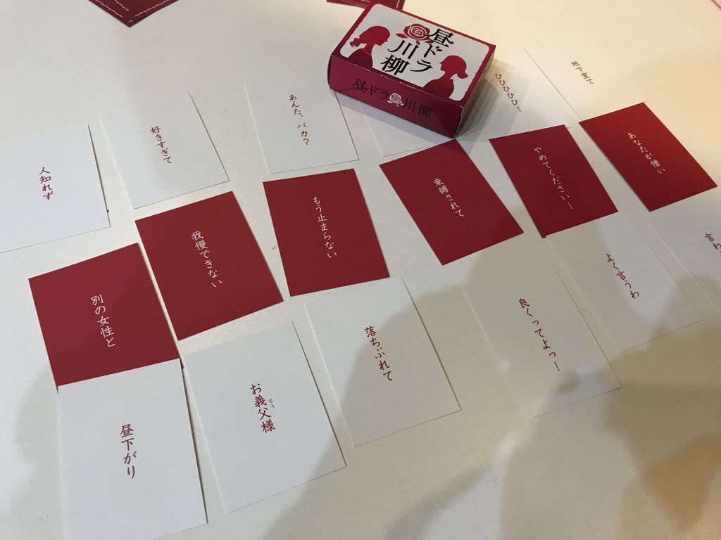 親と子に分かれて、子が手札の5文字のカードと7文字のカードを組み合わせて昼ドラっぽい川柳をつくる。