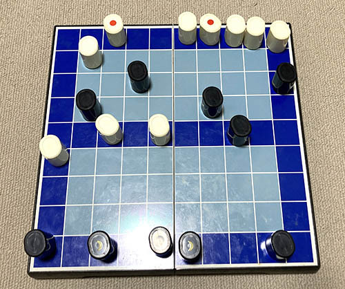 9×10の2色のボードと、12個のコマ(裏表がある)を使って、4つのゲームが遊べる。