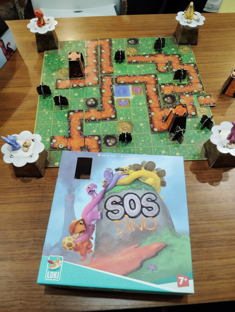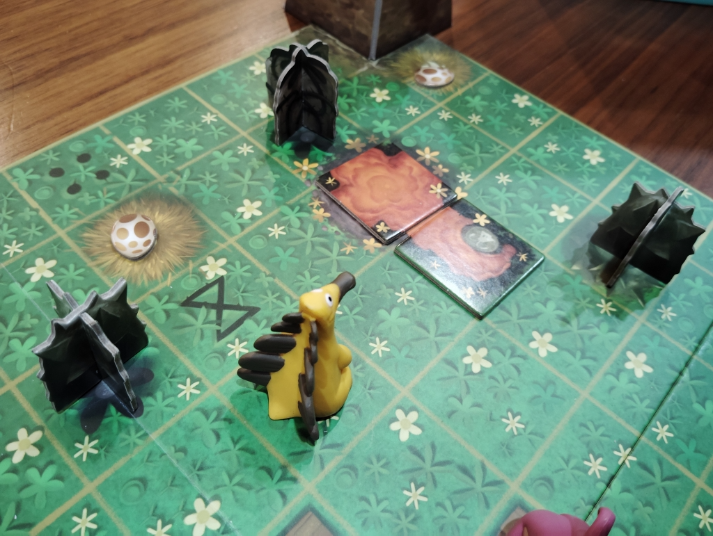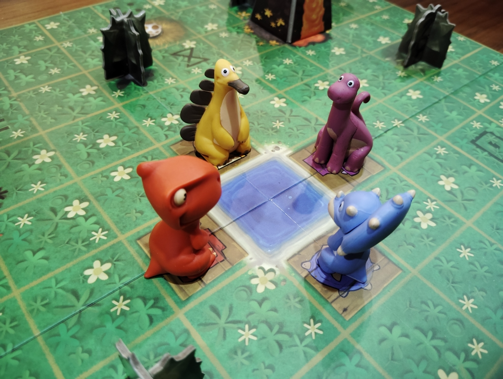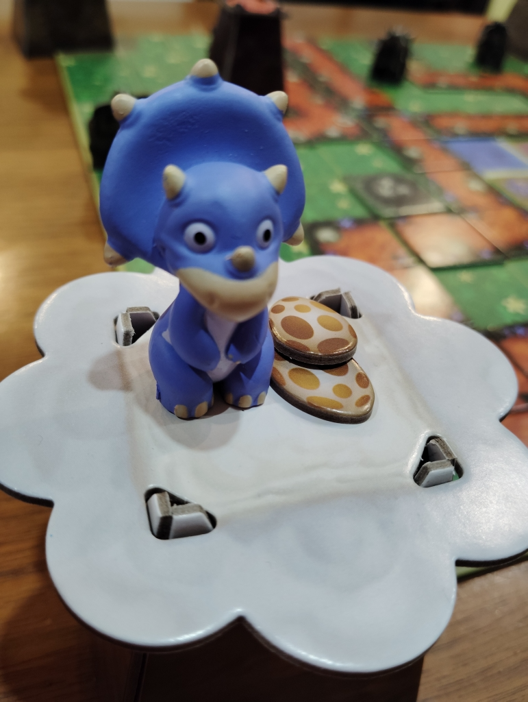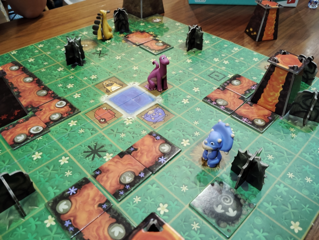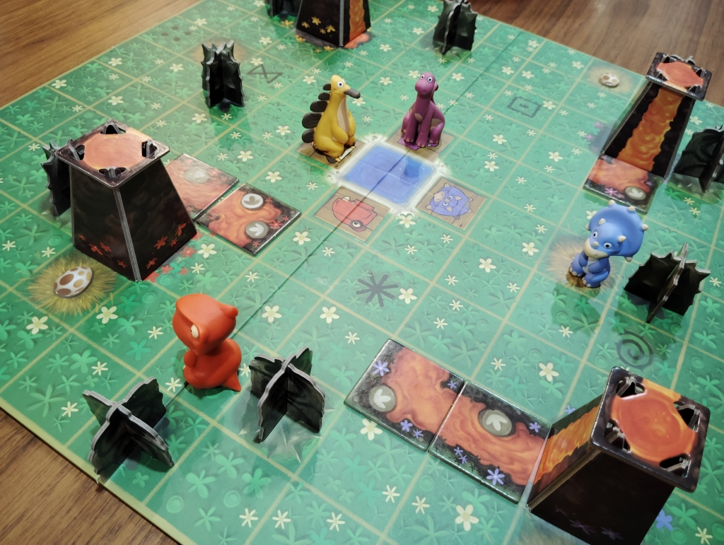 袋からタイルを引いて、恐竜と同じ色の火山に繋がるように配置していき、その色以外の恐竜1頭だけが移動できます。