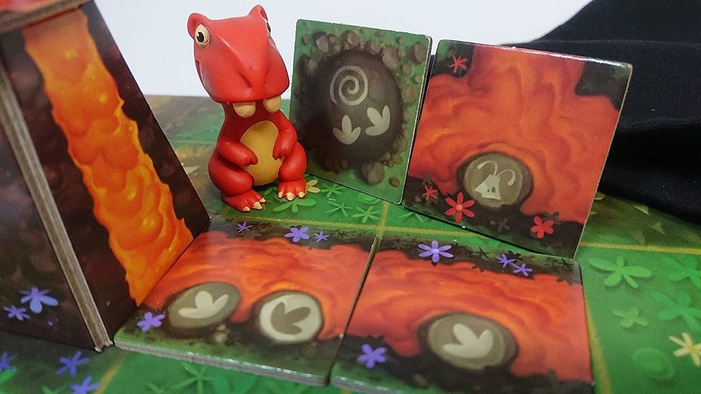 ゲームが進行していくと、溶岩が差し迫ってくる感じが逃げ場を奪っていく感じになり、おそらくタイルの枚数的にも通行不能ばエリアが出来たりもします。恐竜が溶岩に囲まれてしまうことも結構あるかもしれないです。