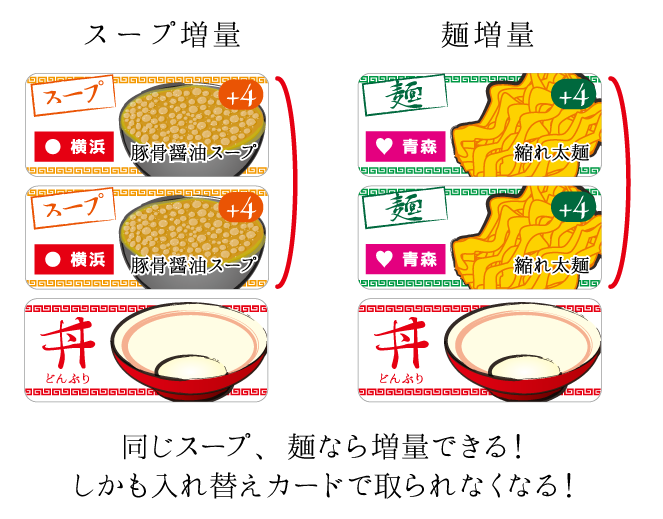 スープと麺は丼に1つずつしか入れられませんが、既に丼に入っているスープ、麺と同じスープメングカードなら丼に追加する事が可能です。(スープ増量・麺増量)