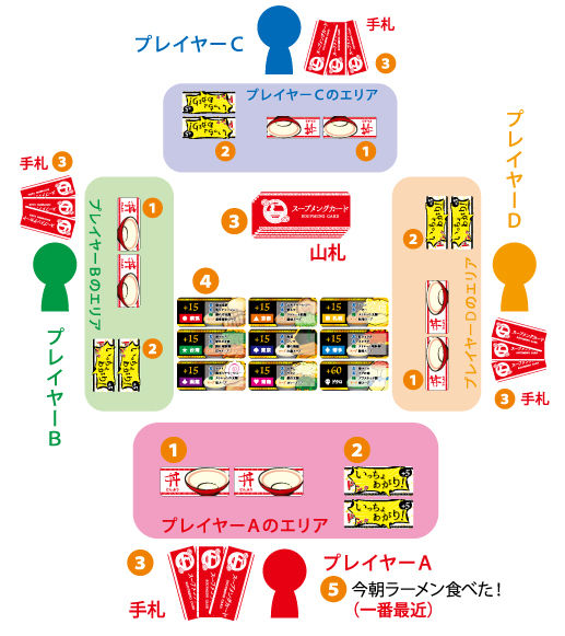 残ったスープメングカードは「スープメングカード」と書かれている面(裏面)を上にして山札として中央に置きます。