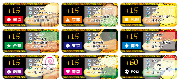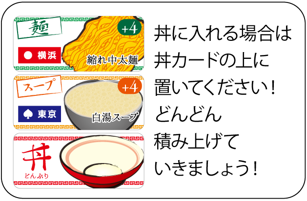 丼にスープと麺が1つずつ、具は2つ以上入っていないといっちょあがり!カードは出せません。