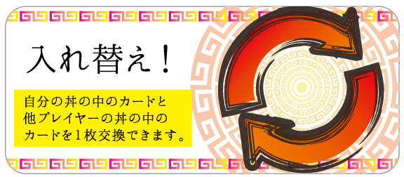 入れ替えカードを出すと、自分の丼内のスープメングカードと他プレイヤーの丼内のスープメングカードを1枚交換できます。