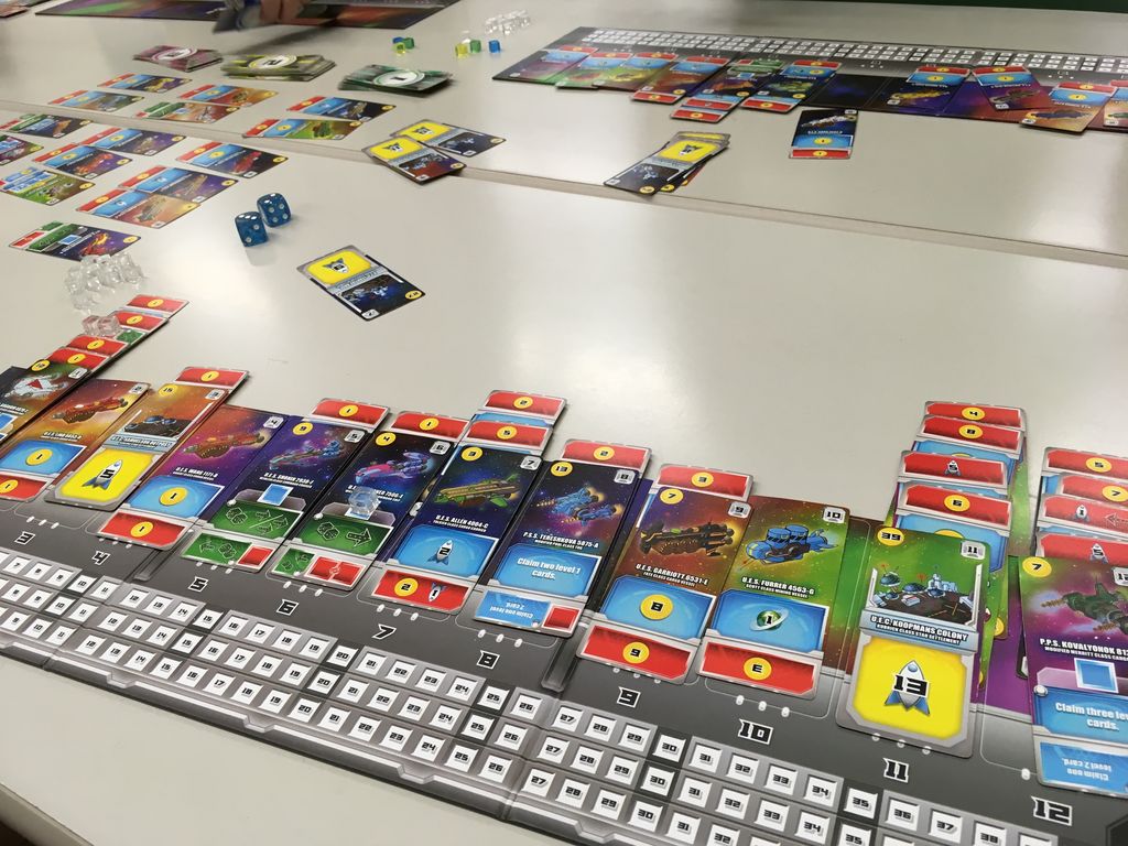 初期手札で8を引けたので、真ん中あたりでなるべく一つの目に特化して、強化する方針だったはずが、思うどおりのカードが現れず、どうもうまくいかない。