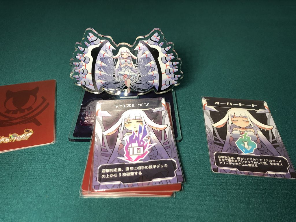 基本カードとかカードとか、あとカード類。ほかはコマとプレイボードとシンプルなコンポーネンツたち。いれものは整理しやすくて良いですね。せっかくなのでアクスタついてくるやつキックしてたみたいです。カードの質感とか良い感じ、イラストやデザインも結構すき。