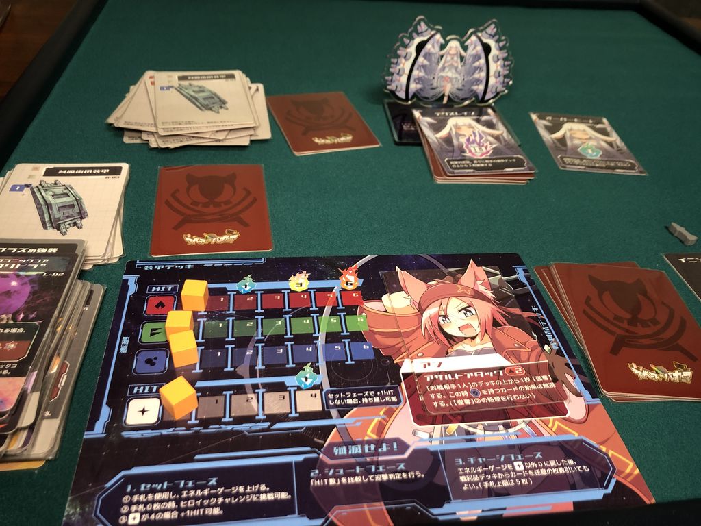 ソロプレイ時は、オートマ戦になります。ソロ専用カードも加えてとりあえず説明書通りにセッティング。ルールは読んでもよくわからないところが多かったので、プレイしながら覚える。