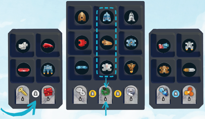 残っている未使用のジャンクタイルは、プレイヤーのボードの近くに表向きに保管され、今後のターンで使用できます。各ロケットパーツの数は限られており、特定のパーツが残っていない場合、それは作成できません。