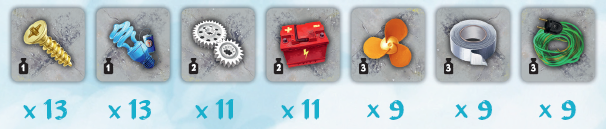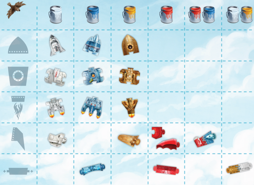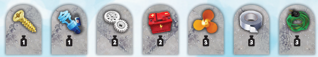 例:ピーターはジャンクヤードを出て、白いフィンと金の機首を作りたいと思っています。 白いフィンを作るには、合計重量が2以上のジャンクタイルが必要であり、少なくとも1本のネジが含まれている必要があります。ピーターはネジを2本(重量1+1=2)持っているので、白いフィンを取るために使います。 金の機首には、ギアを含めて3以上の合計重量が必要です。ピーターはギアタイル(重量2)と電球(重量1)を使って金の機首を獲得します。 |