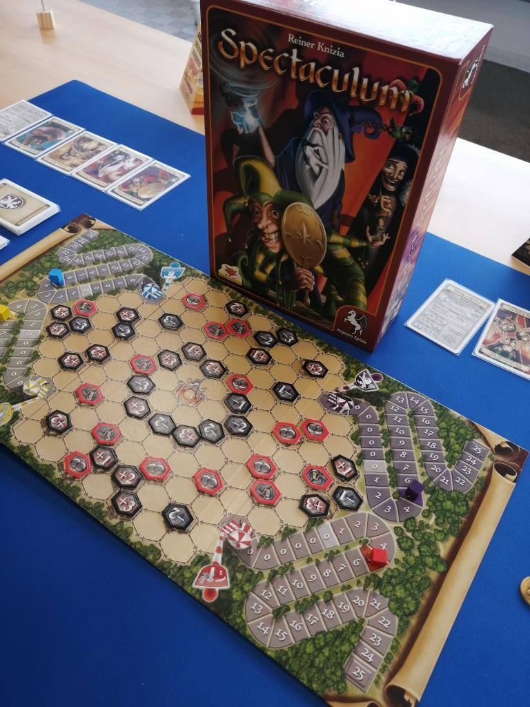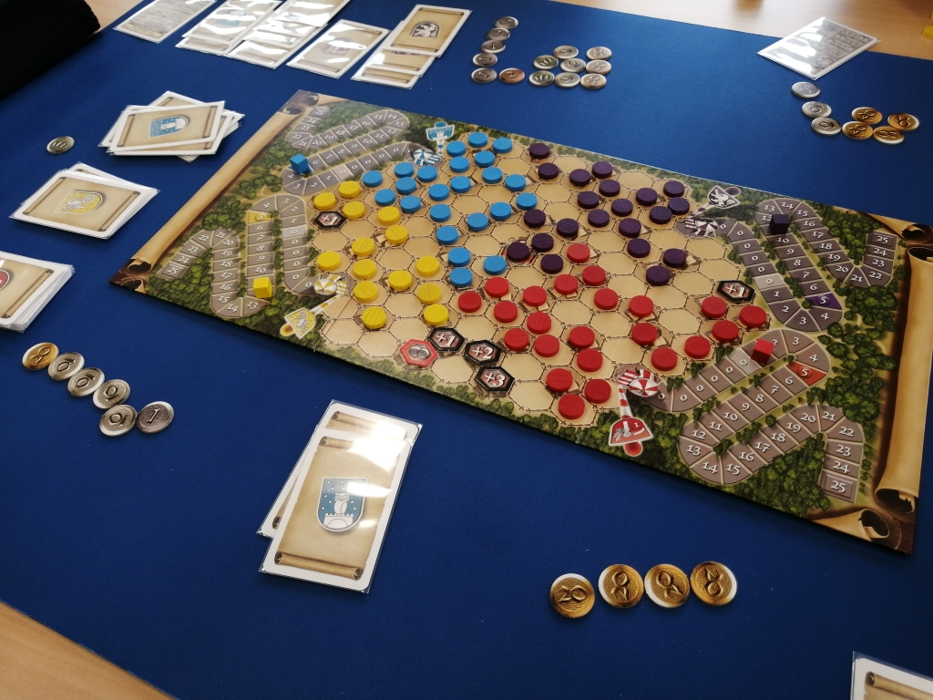 順番はどちらでもいいですが、チップは必ず連続で3枚配置することになります。チップや団員は5色あり、チップは同じ色のチップやスタート地点から隣接するように配置していき、黒タイルのあるマスに配置すると団員の株が上下したりします。