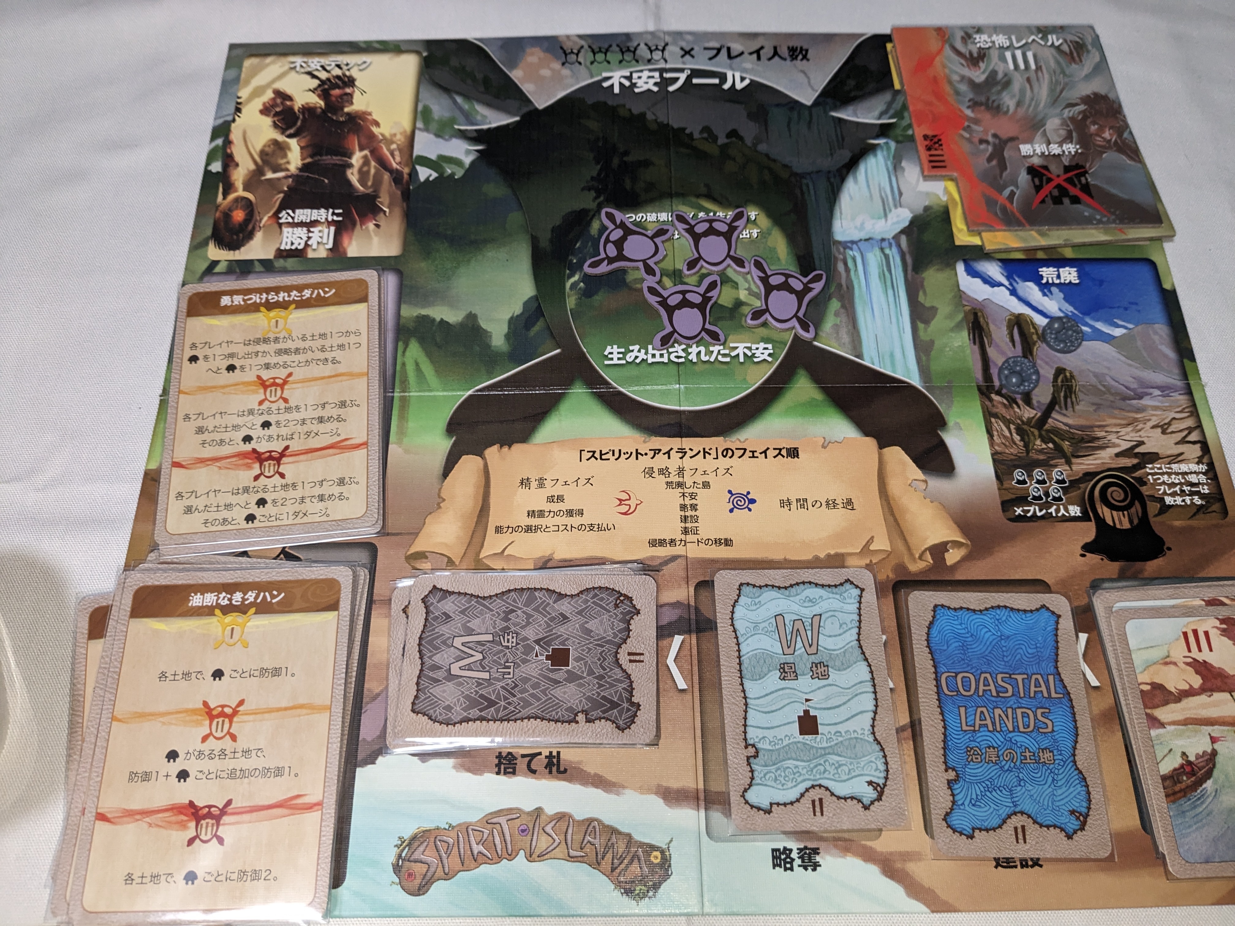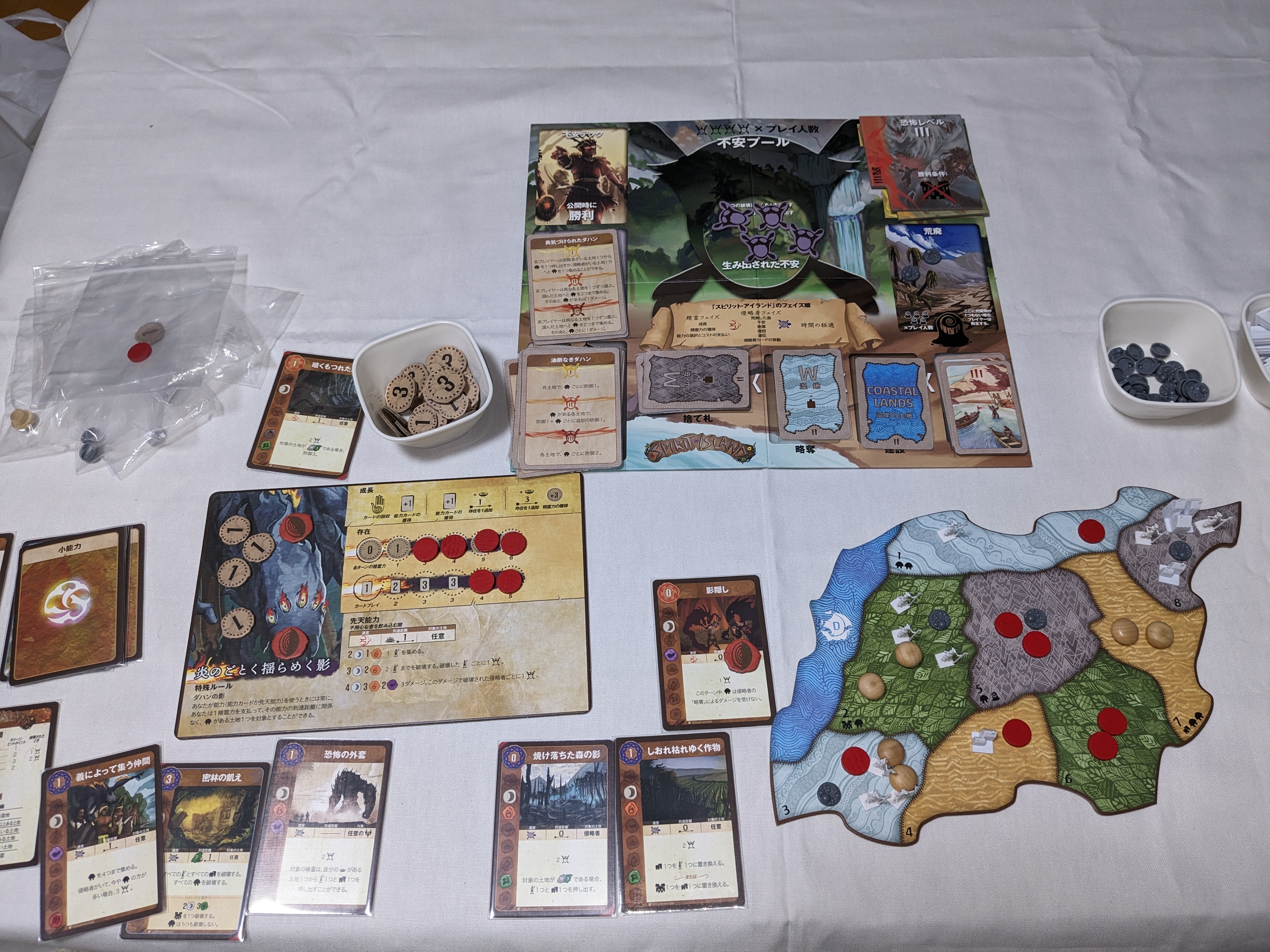 なんとかギリギリまで不安を積みましたが「もはやこれまで…」と思ったところ、引いた不安カード「勇気づけられたダハン」により町へのダメージが入り、最後の不安カードをめくることができました。