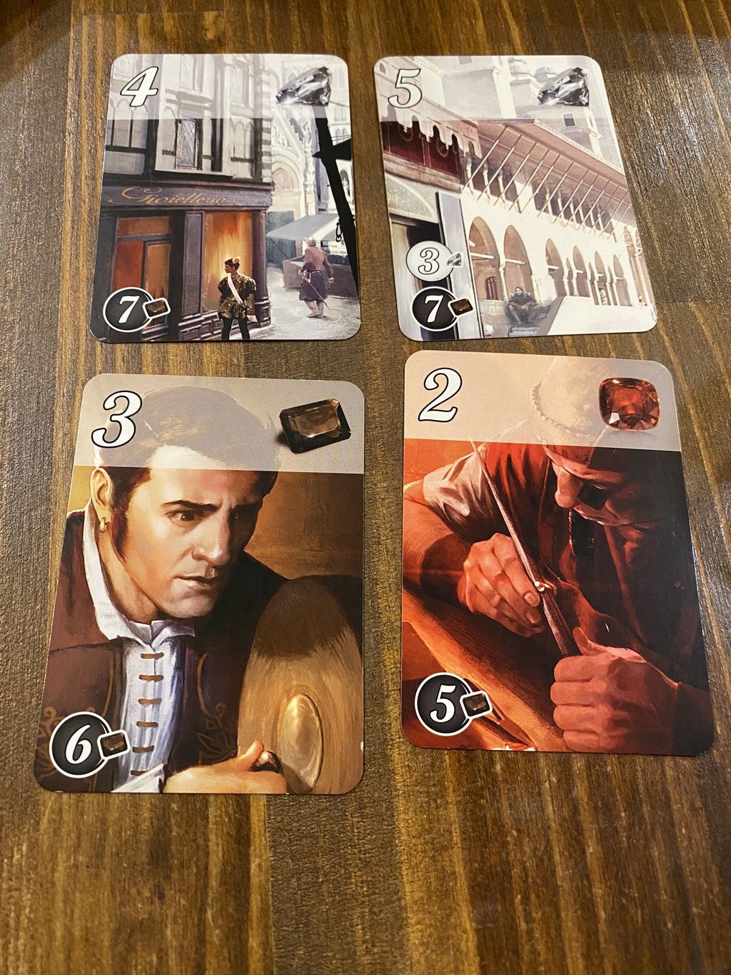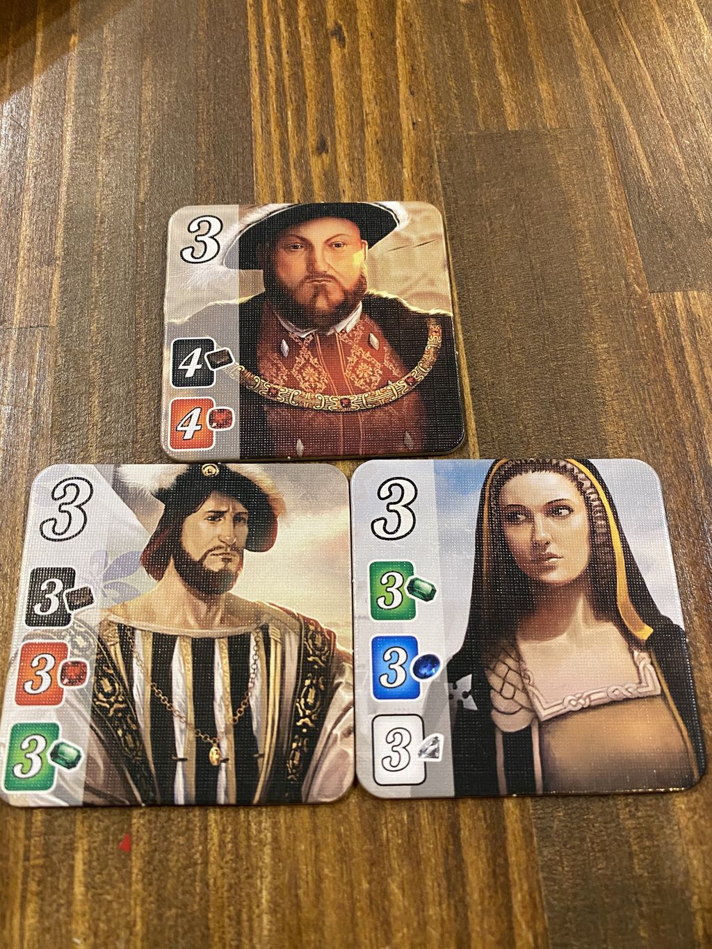 全色3枚ぐらいずつ集めると、1点と2点のカードを集めれるため、毎ターン1.2点を取りながら、貴族を1人で集めて点数化をしていきます。