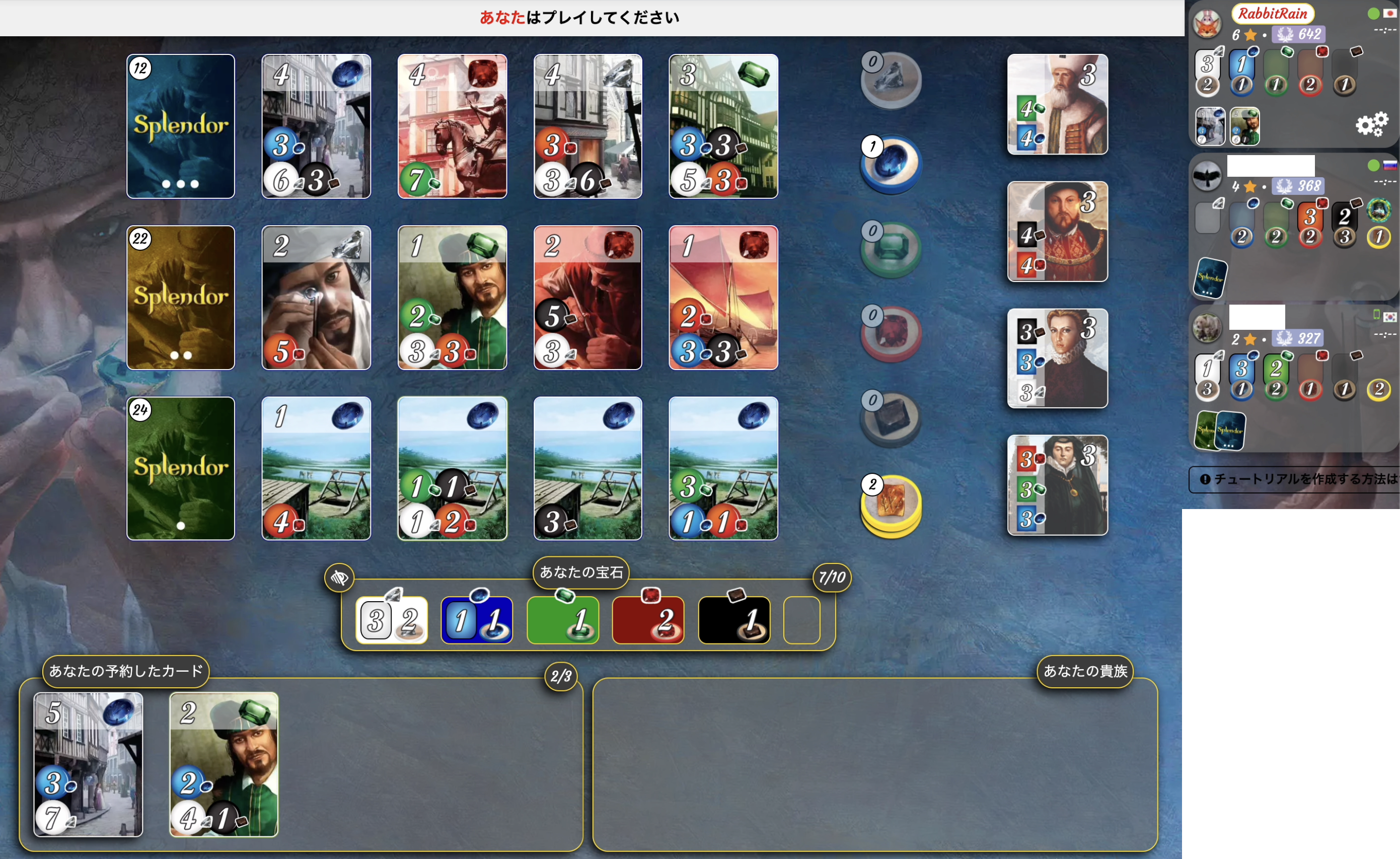 私は現在6点、カードは白3青1、チップは白2青1緑1赤2黒1を入手している状況。「勝利にあと9点必要で、予約したカードで7点取れるから、あと2点どこで取ろうかなー」と考えています。