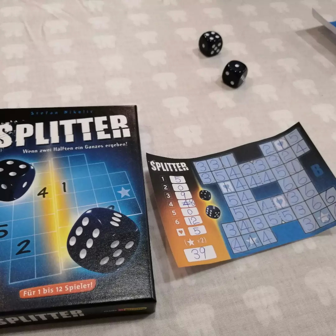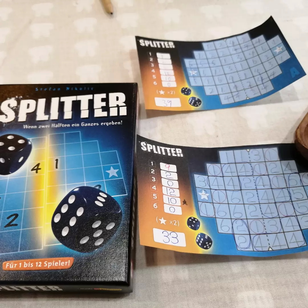 【SPLITTER(スプリッター)】ダイスを2個振り、44マスに2個の出目を対称になるように記入していきます。22回ダイスを振り、出目を記入したら44マス埋まりゲーム終了。数字別に数字と同じだけ隣接していれば、得点を獲得していき合計得点が高いプレイヤーの勝ち。星マスに記入した数字が得点になると倍点獲得です。2種類のシートがあり、ハートマスがあるシートではハートマスに同じ数字を3個記入できればボーナス5点獲得です。