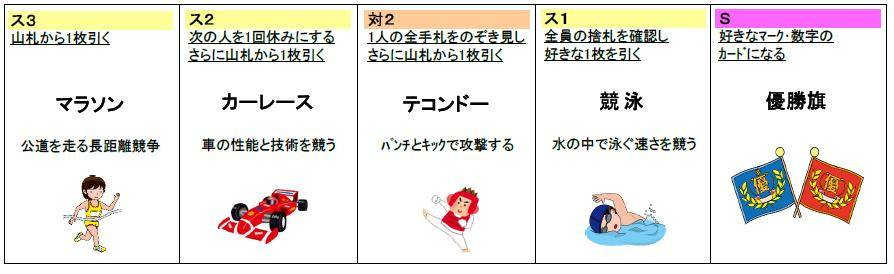「1枚入れ替え」「偵察」「捨札回収」「オールマイティ―」「点数増加」など