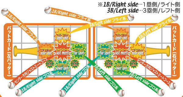 バットの当たった位置により、打球の種類(ジャストミート、フライ系、ゴロ系)や方向(ライト・センター・レフト)が変わります。