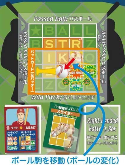 | バッターは変化を予想しスイング(バットカードを敷くように置く)、または見送り。 |