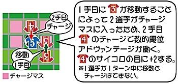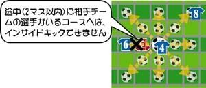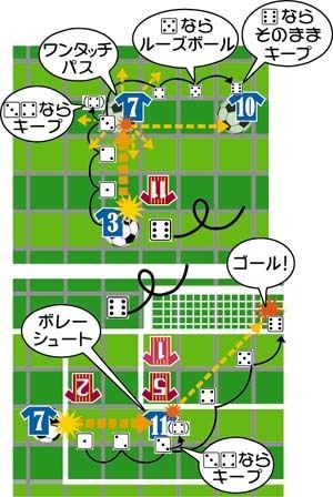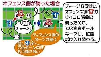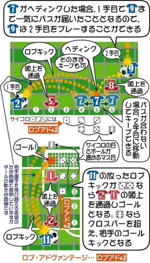 【ロブキック】…フライのキック。サイコロの目の数(1・2・3には+2のアドバンテージがつくので3・4・4・5・5・6マス)がボールの着地点。