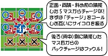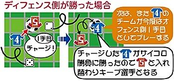 ※チャージマスにディフェンス2選手いる場合、数的優位となり、サイコロの目に+2アドバンテージがつく