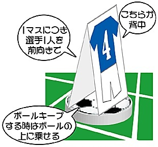 各チーム11人の選手を1人1マスに配置。キーパー以外、フォーメーションは自由。