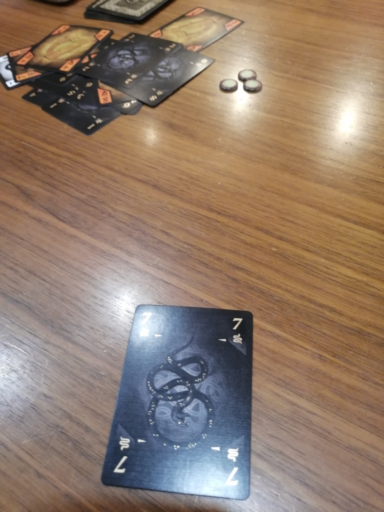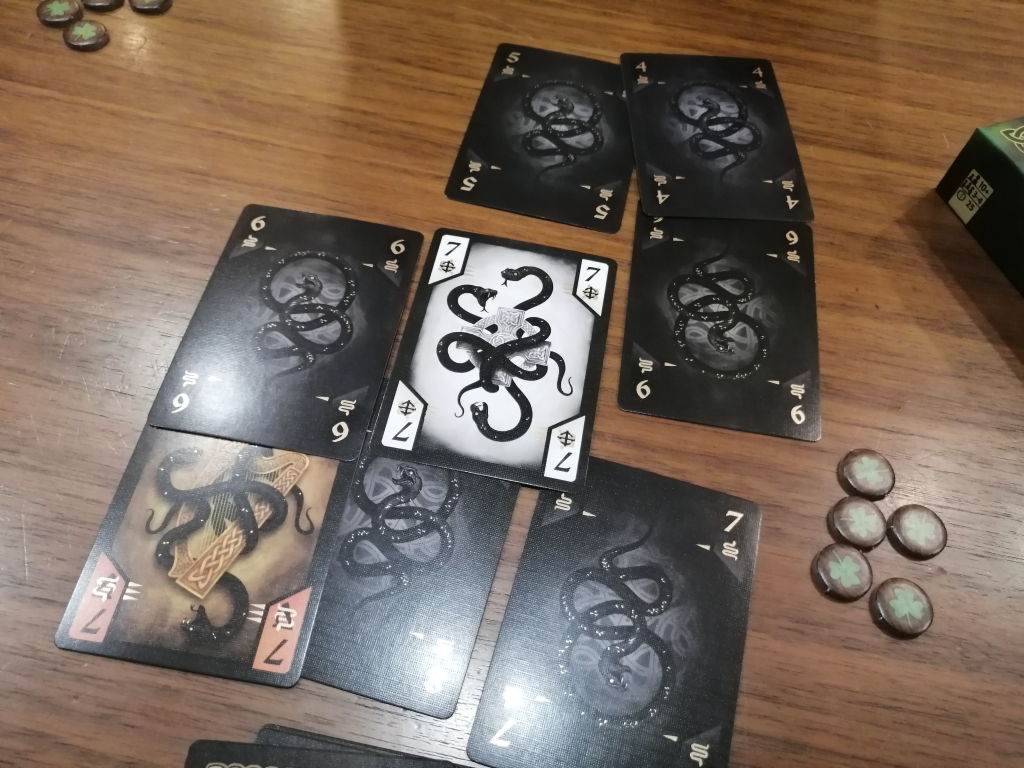 リードカラーの中で一番大きい数字をプレイしたらトリックを獲得する。獲得した蛇のカードは公開しておき、あとのカードは伏せる。