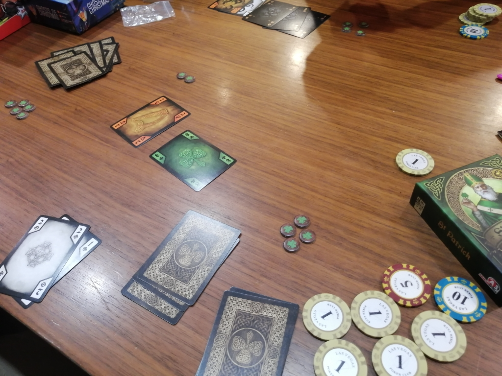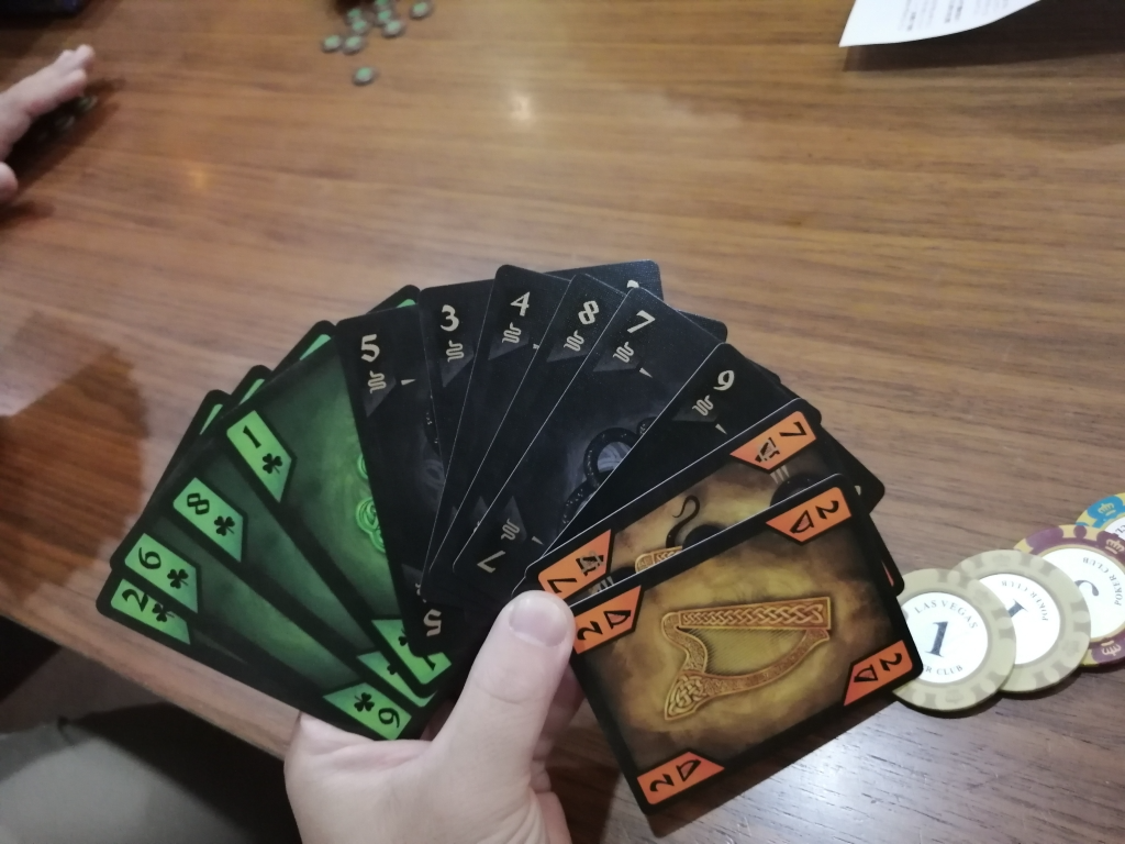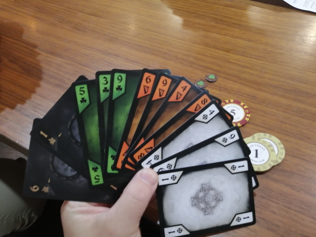 2〜3人のマストフォロー切り札なしのトリックテイキングゲーム。スートは4色1〜9で、黒には全て蛇が描かれていてオレンジと白の7にも蛇が描かれている。緑の7はスタピーおじさんが描かれています。
