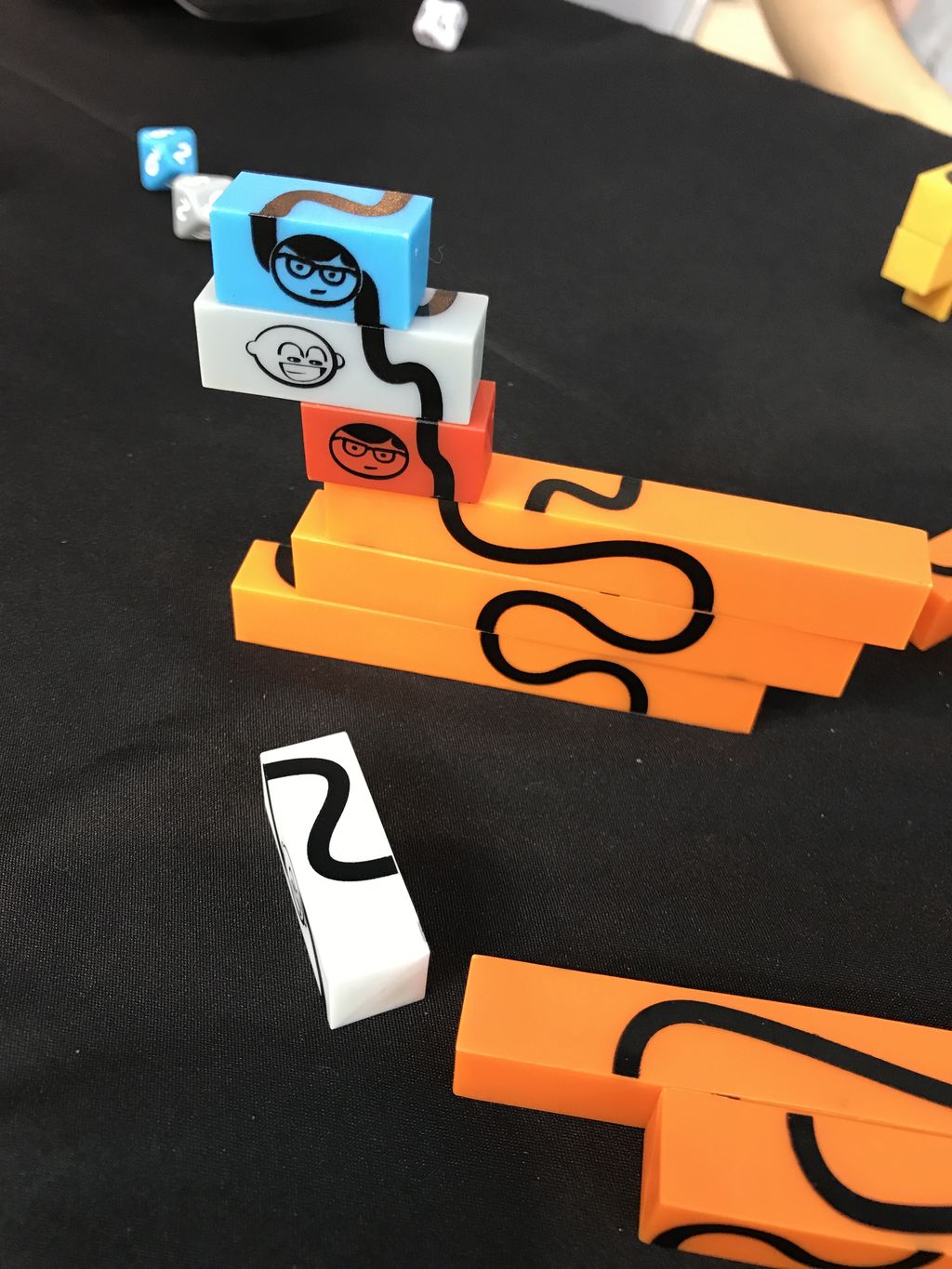 ダイスを振って、ダイスの色のスティックを出た目の段に置かないといけません。1段目とかに来ると、もう危ない。1ラウンド目は6段、2ラウンド目は7段・・・とゴールが低いところから設定されているので、まずやってみてどんどん上達していく感じが味わえます。