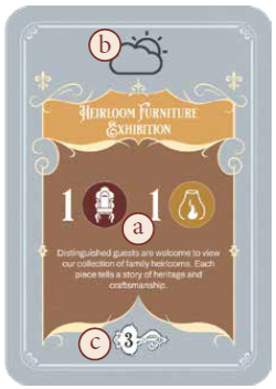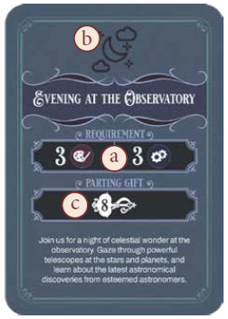 これらは、手札から1人のプレイヤーが主催するイベントです。主催するには、カードのカテゴリ要件(a)を満たし、現在の時刻がカードのアイコン(b)と一致する必要があります。イベント要件はさまざまです。プレイエリアに特定の数のカードカテゴリを用意する必要があるものもあれば、特定の部屋を完成させたり、あなたの家の中にエステートピースを配置したりする必要がある場合もあります。 |