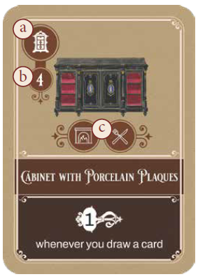 • 左上のアイコン(a)は、家に置く物理的なエステートピースと、このカードが属するカテゴリの両方を識別します。