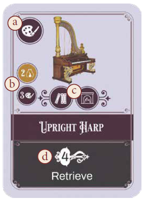 • 下部のテキスト(d)には、固有のカード効果が詳しく記載されています。(すべてのアート、家具、イノベーション、および照明カード効果の完全なリストについては、16ページのクイックリファレンスを参照してください。)