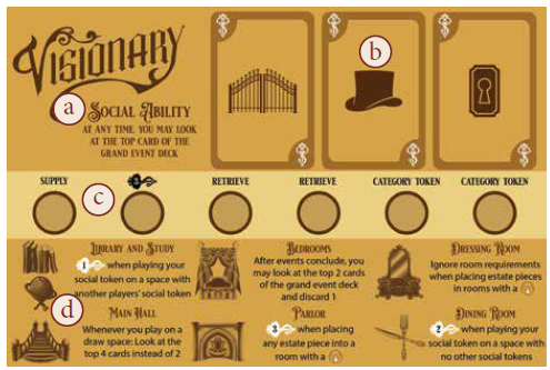 プレイヤーボードは操作の中心です。展示する名誉あるアイテム、実行できる強力なアクション、アンロックしたユニークなボーナスを追跡します。各キャラクターの社会的能力と部屋ボーナスは異なりますが、プレステージトークンスロットはすべてのボードで同じです。 |