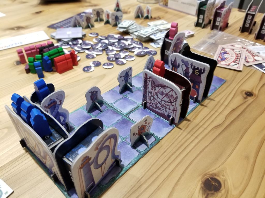 アトラクションとお客さんは、それぞれ6色ありますが、色による違いはありません(見た目だけです)。写真だと分かりにくいですが、アトラクションの色=客の色です。青のアトラクションには青のお客さんしか基本的には乗ってくれません。一度乗ったお客さんはゲーム終了まで乗り続けて毎ラウンドお金とゴミを落とします。お客さんを呼び込むときは、付属の袋(ゲームの準備で各色1人ずついれています)に好きな色のお客さんを入れて、入れた数だけ引きます。「案内所」という施設を建てていれば、正しくない色のアトラクションに乗せることができます。(正しくない色のアトラクションに乗ったお客さんは、お金は落としますが、ラウンド終了時に帰ってしまい、ゴミは落としません。ありがたい!)