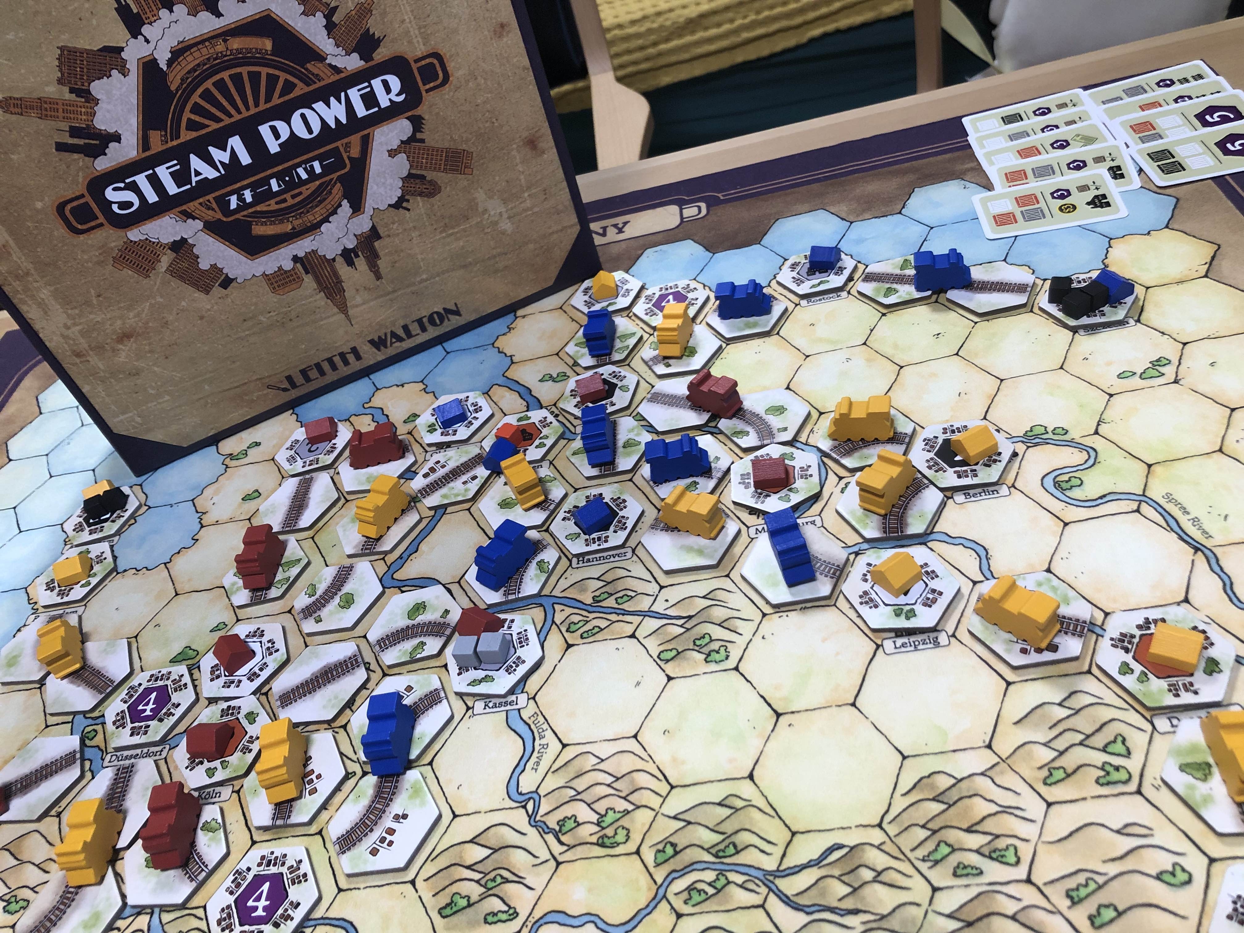 スチームパワーは、線路を繋ぎ資源の調達ルートを確保し契約を履行しながら勝利点を稼ぐ ボードゲームです。
