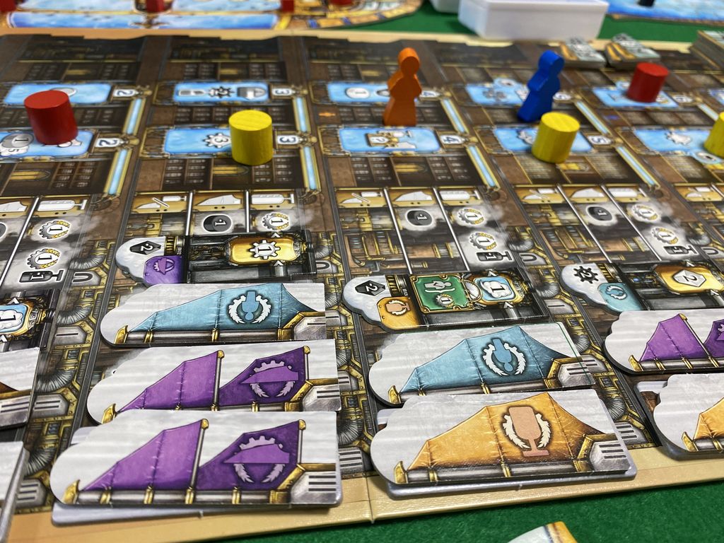 スチーモポリスの各階には工場と市場があり、その場所に蒸気トークンをワーカーとして設置していきます。市場で装置を購入し、自分の飛行船装置をパワーアップさせることにより、より効率よく蒸気を貯めたり資源を生産できるようになります。