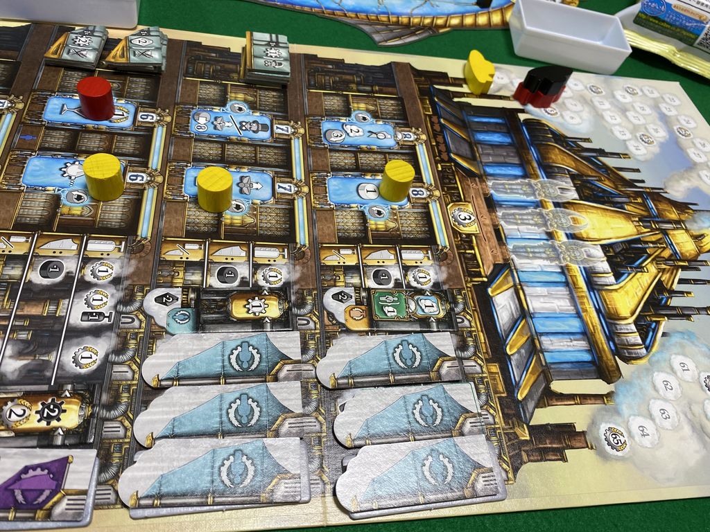 蒸気トークンの動かし方が独特で最初とまどいますが、慣れれば簡単で「A:蒸気圧の上昇」アクションで飛行船の蒸気を貯めて、「B:蒸気の利用」アクションで飛行船の装置を発動、さらに蒸気トークンを使って工場スペースを確保します。そして「C:工場への飛行」アクションにより確保した工場スペースを利用していきます。