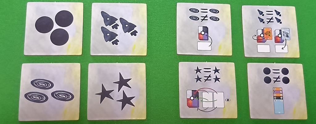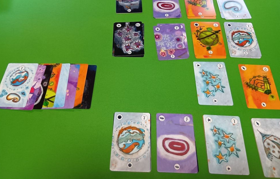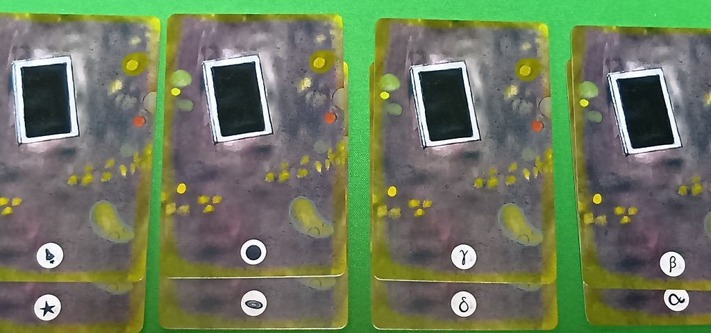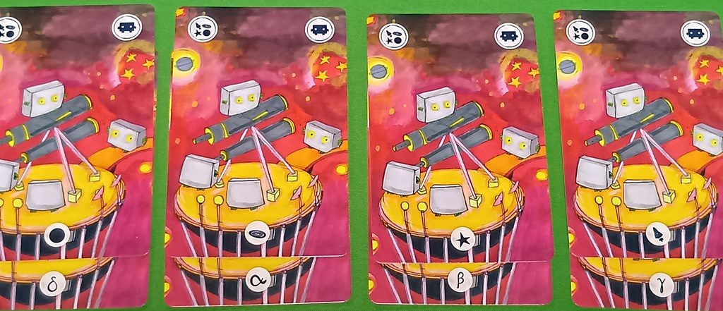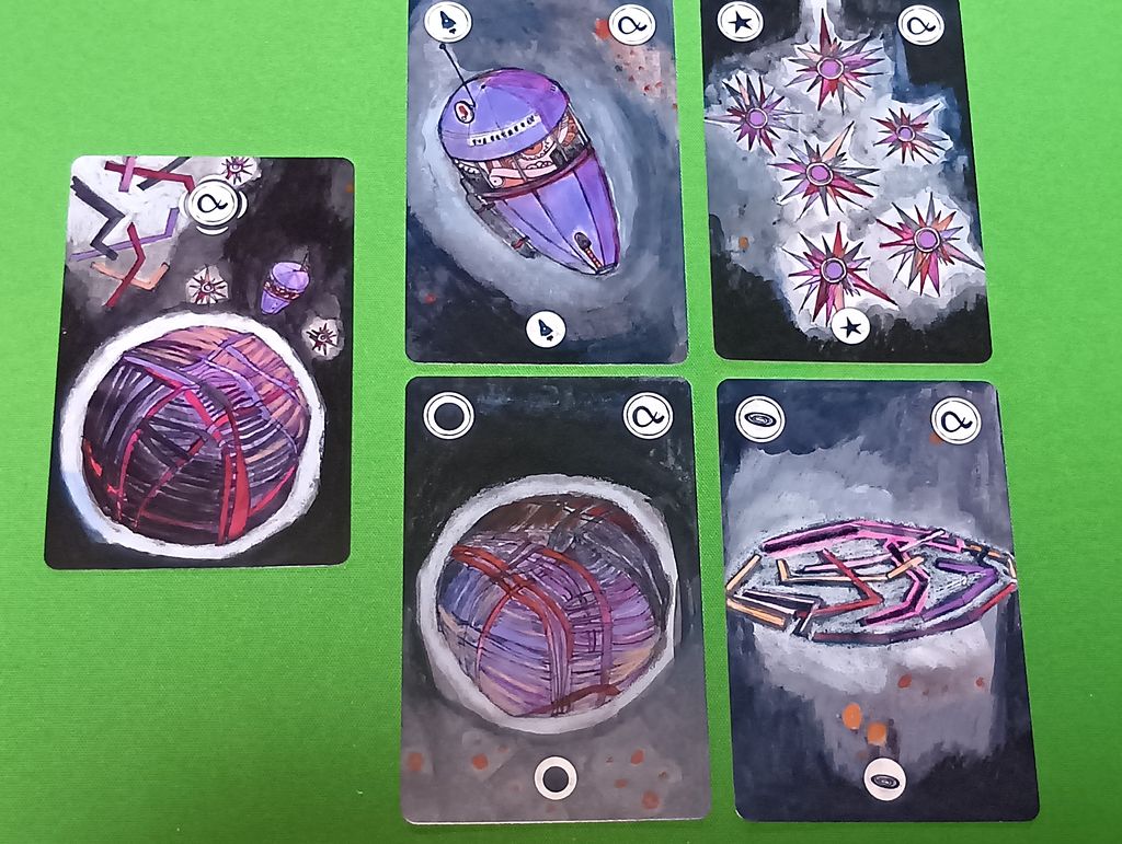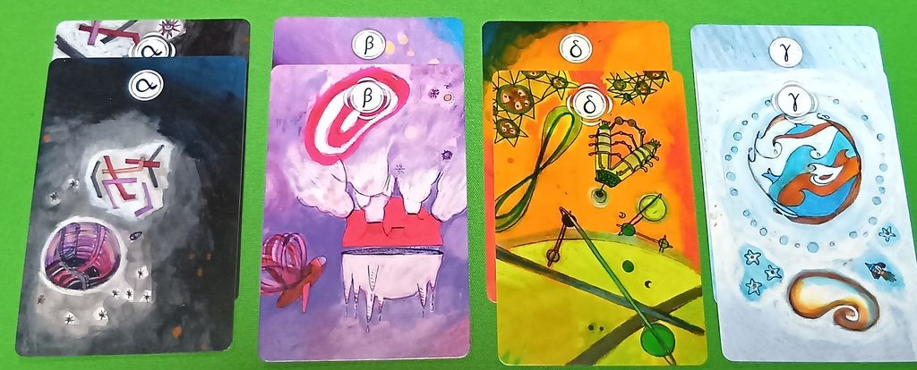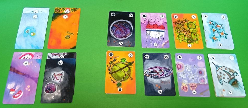 8つのデッキはカード下部に描かれたアイコン(トラベルカードに合致する4つの銀河α・β・γ・δ、それとロケット打ち上げに必要な4つの要素ロケット・惑星・星・星雲)で分けられます。それぞれのデッキ内には4種×2枚のカードが入っています。(銀河のデッキはその銀河内の4要素×2,要素デッキは要素×4銀河分といった具合)