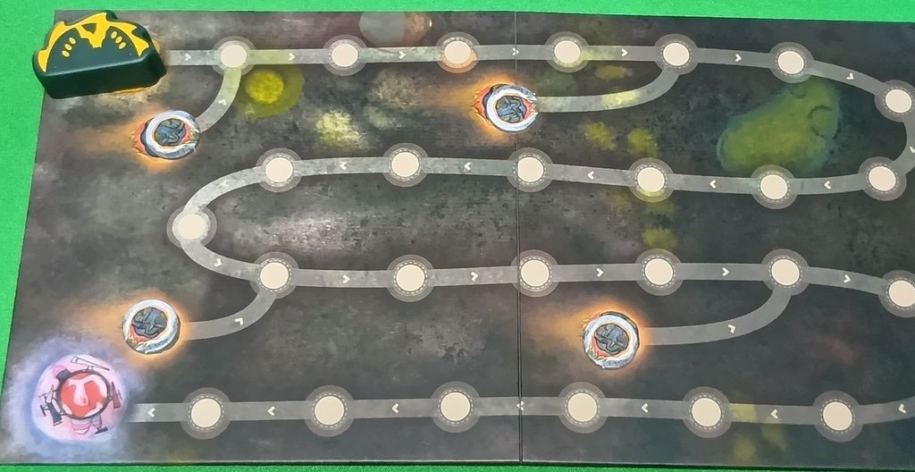 ④青灰色の太陽(THE GLAUCOUS SUN):真打。ボードと「青灰色の太陽」コマ(以下太陽コマ)、「メテオトークン」が追加になります。太陽コマがゴールに行きつく前に勝利条件を満たす必要があるんですが、移動はこちらのアクションと連動、後退させるにはこちらの「カードを捨てて得られる効果」を犠牲にしないといけません。