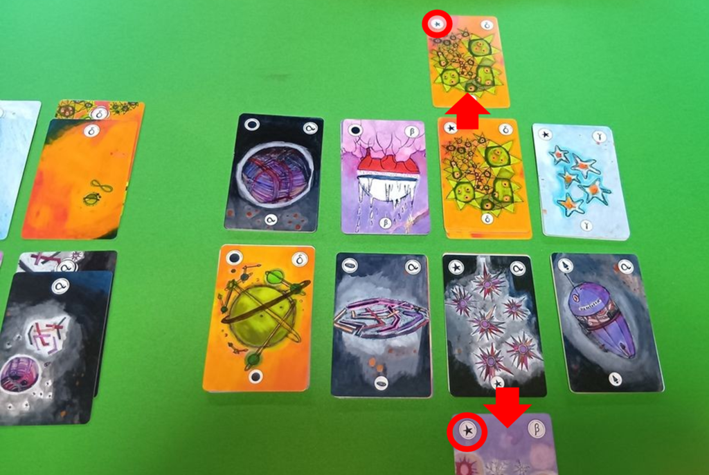②カードを捨てて効果発動:同じタイプのカード2枚(惑星2枚、星2枚、星雲2枚、ロケット2枚)を捨て札にすることで効果を発動します。同一カードを捨てる場合は効果が2倍になります。