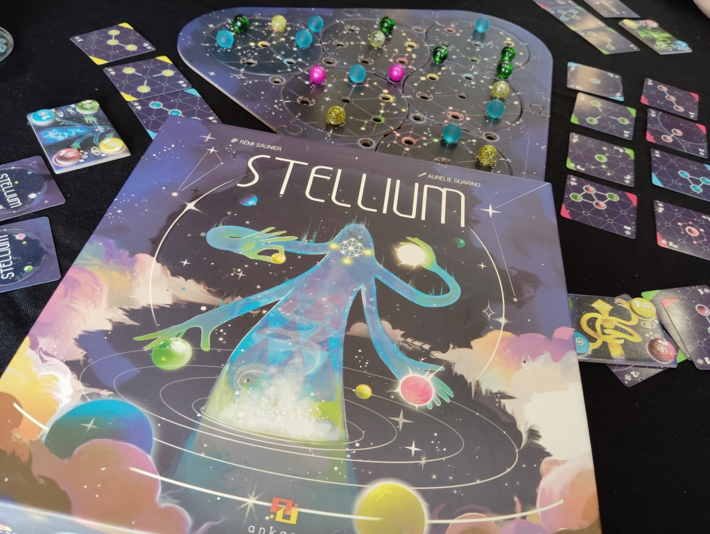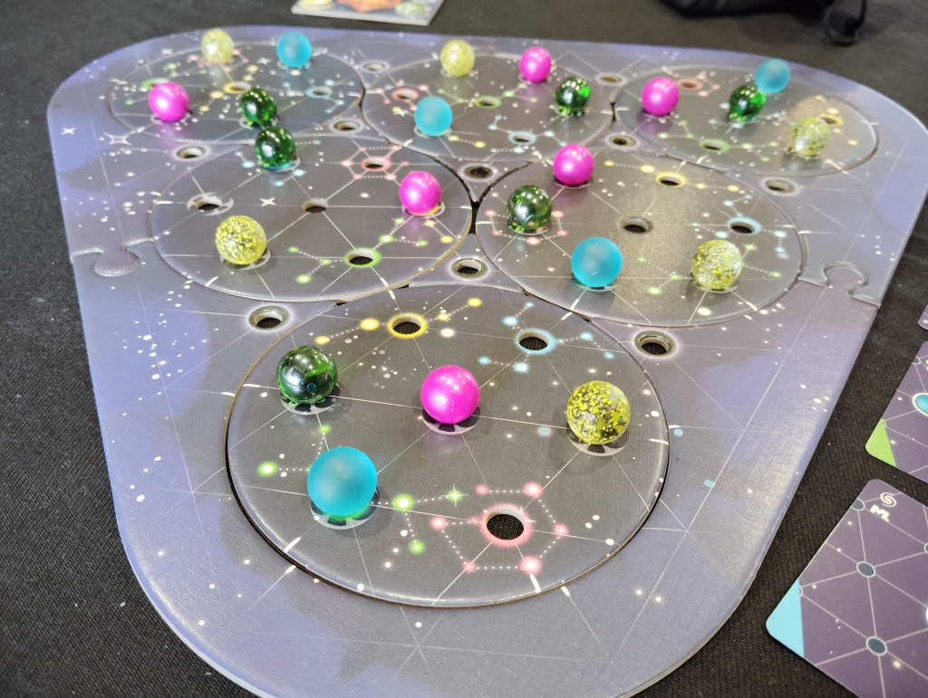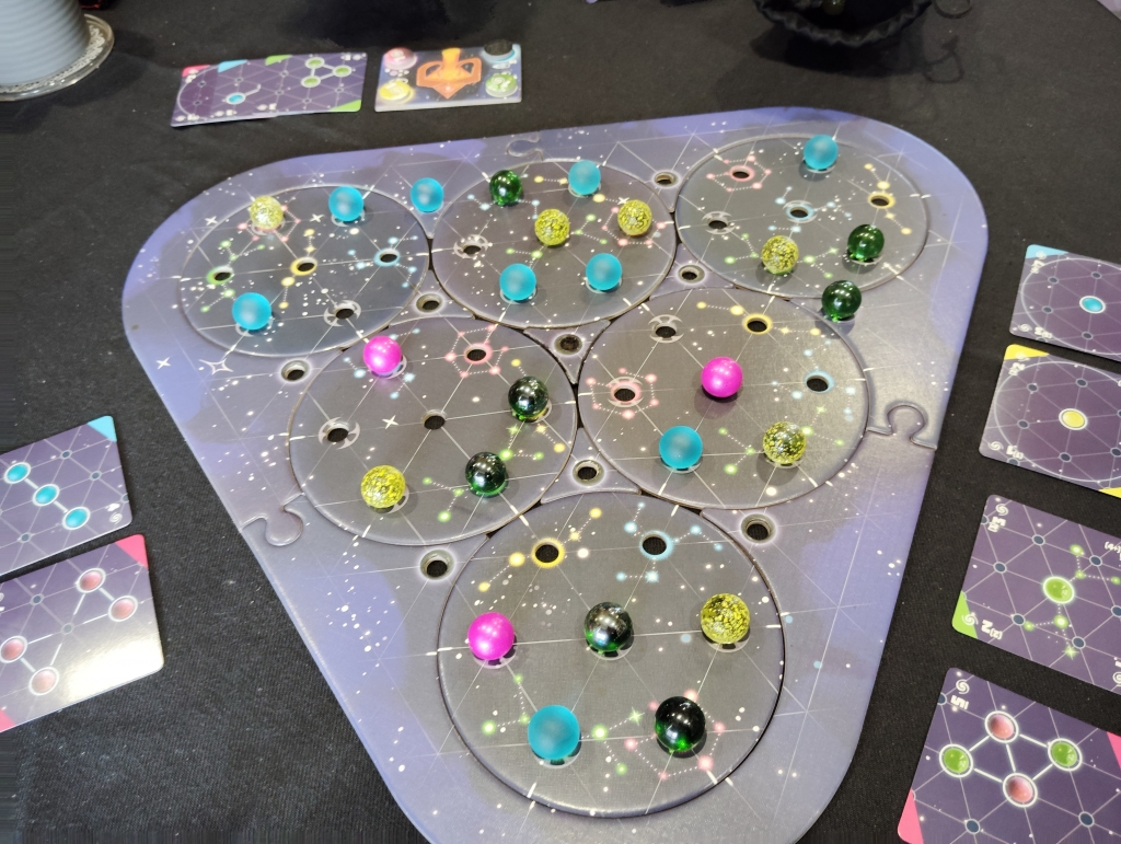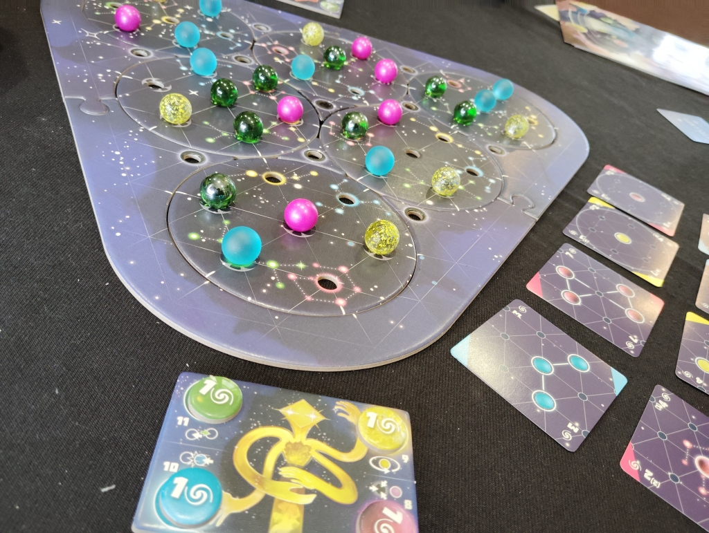 袋から惑星を取り出して配置→目標配置カードの達成の確認→目標カードを獲得(目標カードは3枚で所持可能)を繰り返していき、誰かが20点以上獲得したら手番を一緒にしてゲーム終了。