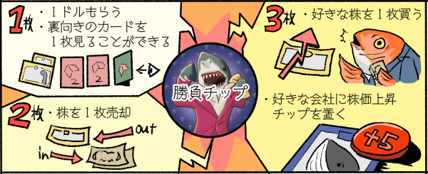 ウラ向きの情報カードを1枚見たり、もう一回株を売ったり、自分が情報カードを置いていない会社の株を買ったり、好きな会社の株価を無条件に上昇させる「株価上昇チップ」を置いたり。