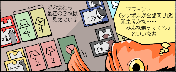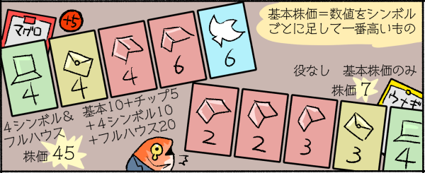 情報カードをオモテにして、ポーカーの役によって株価が決定します。株価が高かった会社も、役が全然揃わなかったら大暴落してしまいます!