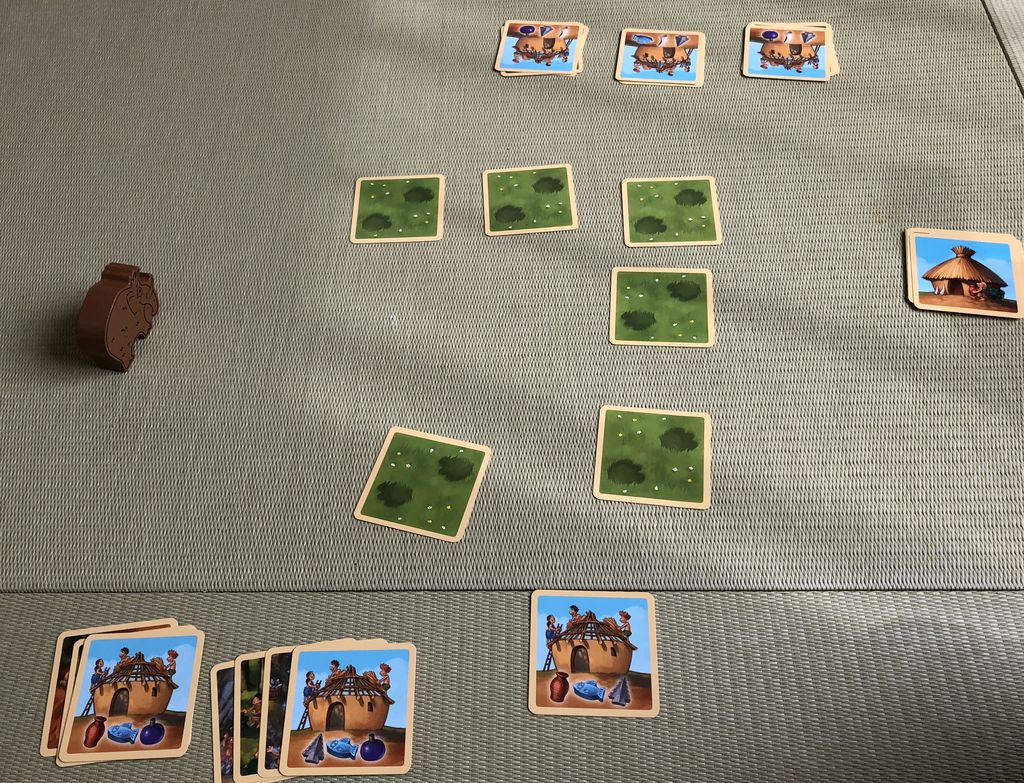 これを繰り返して、小屋カードの記載されている品物カードを3つ揃えたら、新しい小屋カードを獲得でき、さらに品物カードを揃えていきます。