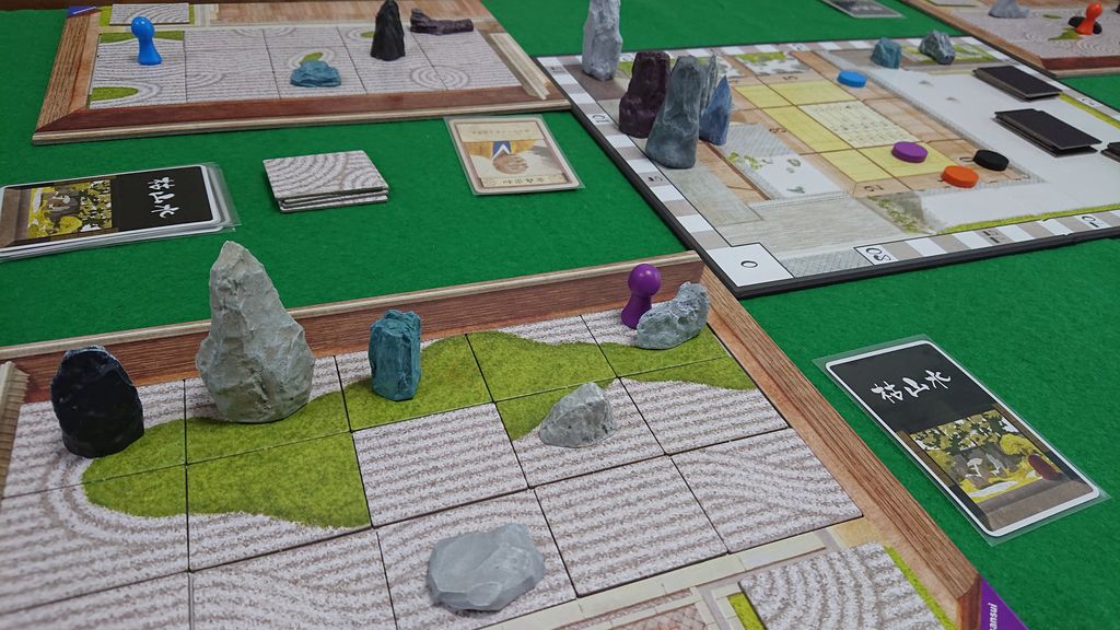 夫も残念ながら砂紋を左右対称にはできず、空いたスペースで桂馬置きボーナスを狙いましたが、手数が足りませんでした。最後に作庭家カードを使用し、徳を4積みました。