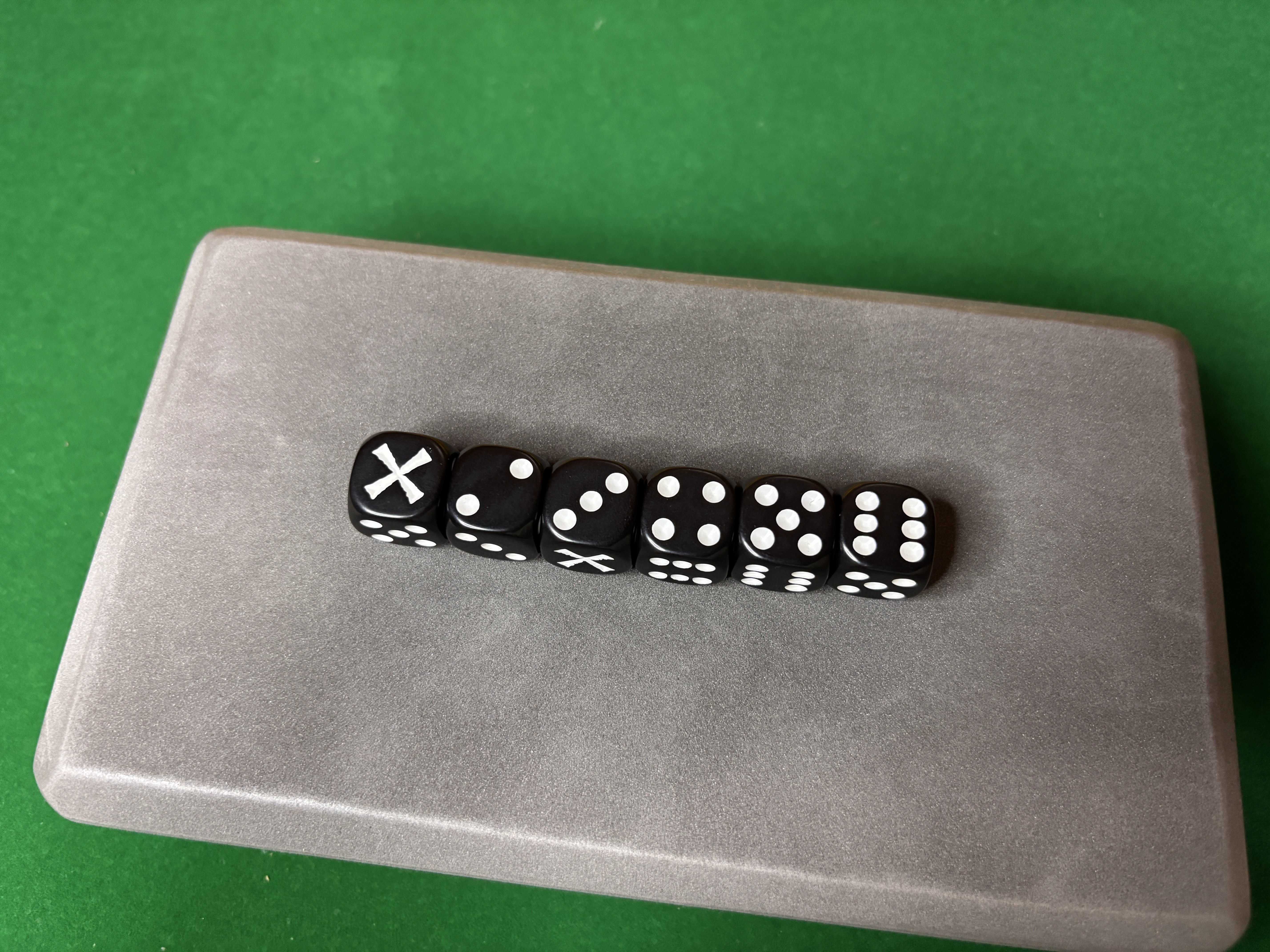 ダイスには✖️の目が含まれておりこの目が出た場合はゲームから除外します。