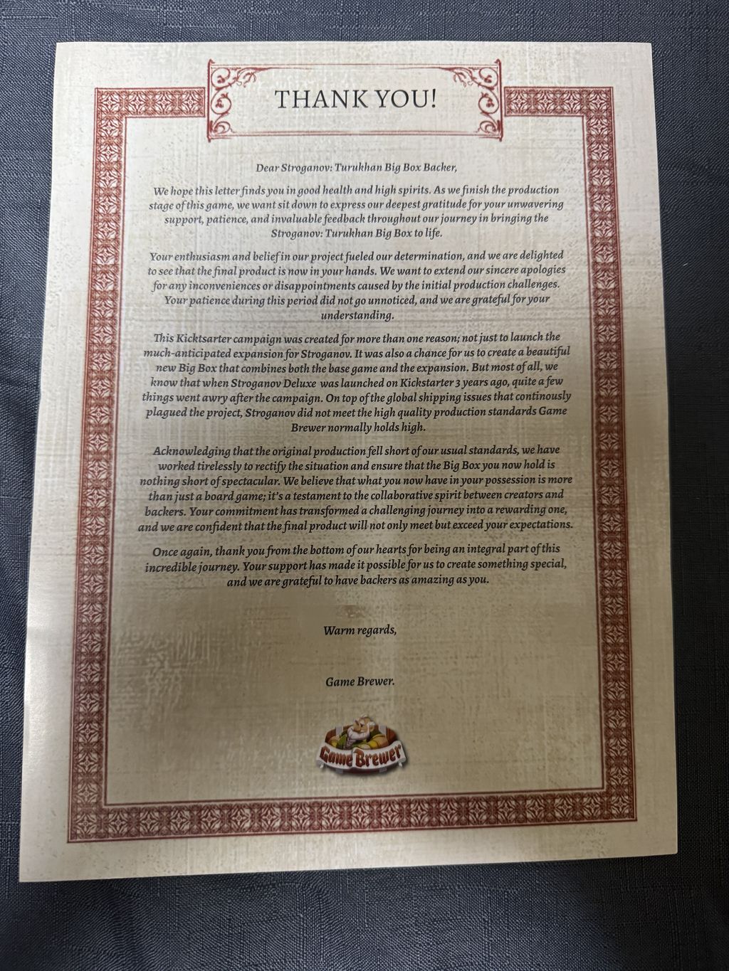 彼らが最後に出版したゲームの中に、ストロガノフの拡張とビッグボックスがあった。もちろんわたしも出資し、25年の5月、ついに手元にそれが届いた。